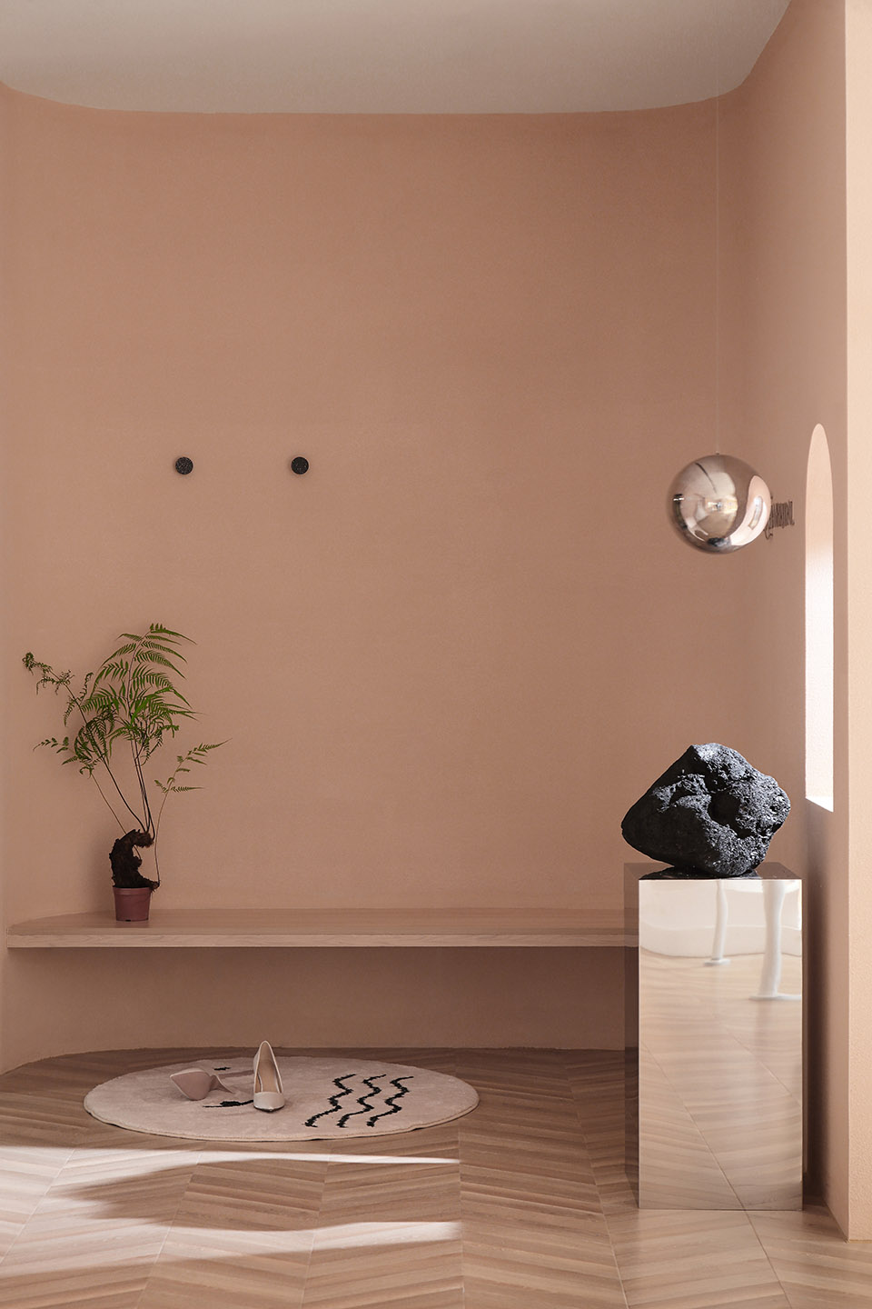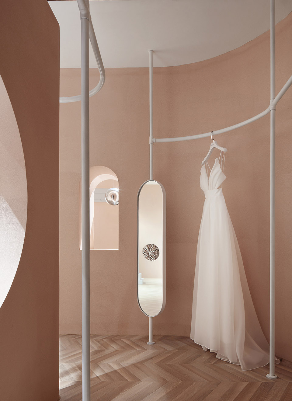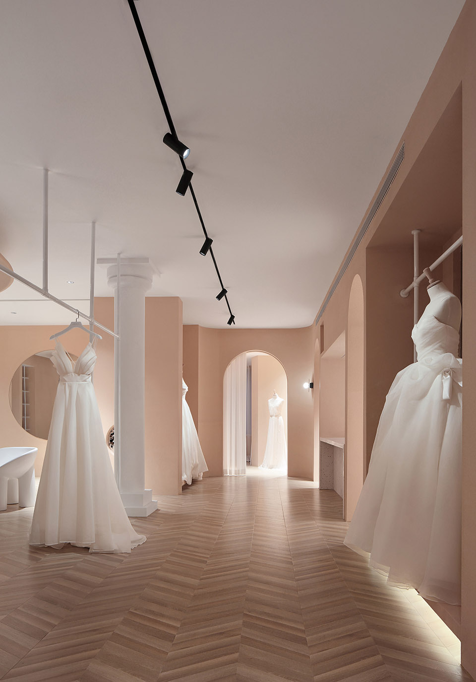 试穿婚纱是感受幸福的关键,我们希望在顾客踏入这个空间时即可感知到它的氛围。我们用圆润、有机型态的弧形单品,提升空间的温暖和包容力。