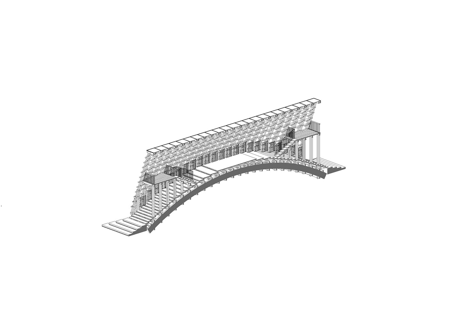 从桥顶俯瞰的平面图是完整方形,桥的侧立面“上-左-右”外轮廓也呈方形、只有“下”部顺应“拱”的型态自然取弧,这使得桥廊内部生成“高-低-高”空间渐变。在桥廊的两端由于空间高为了结构稳定在中段设置了横向连接杆件,基于这个结构必要措施搭放了两个观景平台,这平台也避免了从出口处就对廊桥内部一览无余的空间单调感。