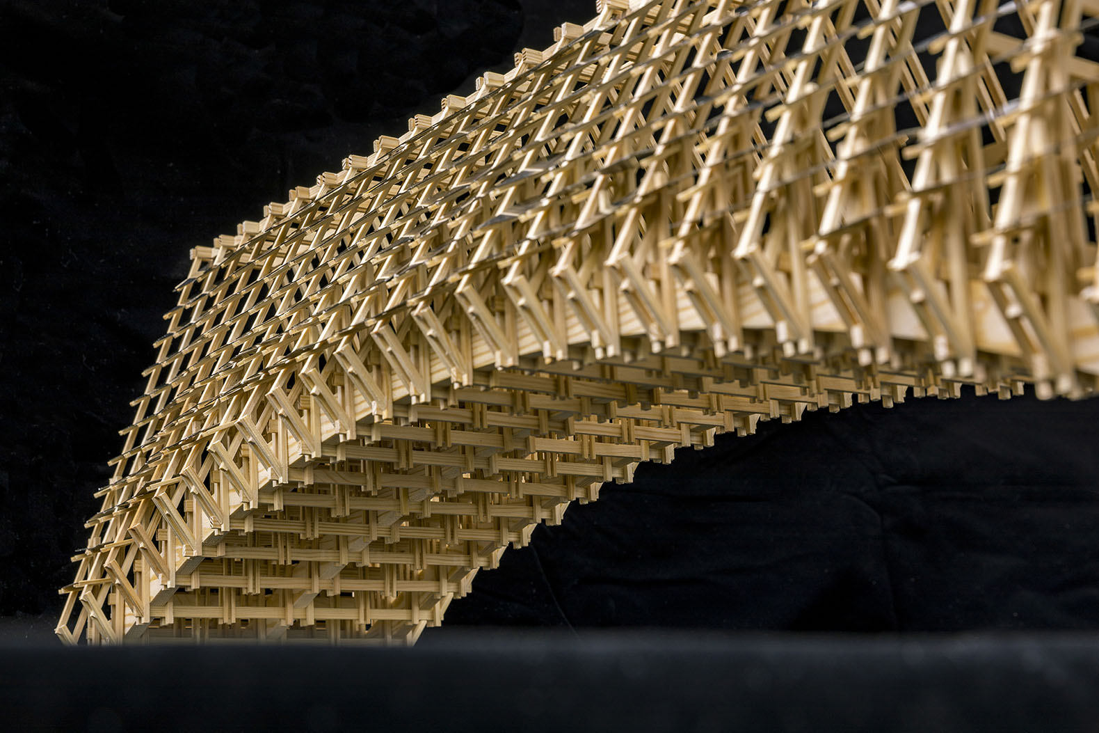 除了承担桥体主荷载的三根大木拱梁截面为600mm*300mm外,其他的木料采取了小截面木料(100mm*100mm、100mm*50mm规格)的建造方式,将小木料于三根大主梁进行上下次梁咬接固定,再从这些小次梁的两端向上收合形成三角受力型态。