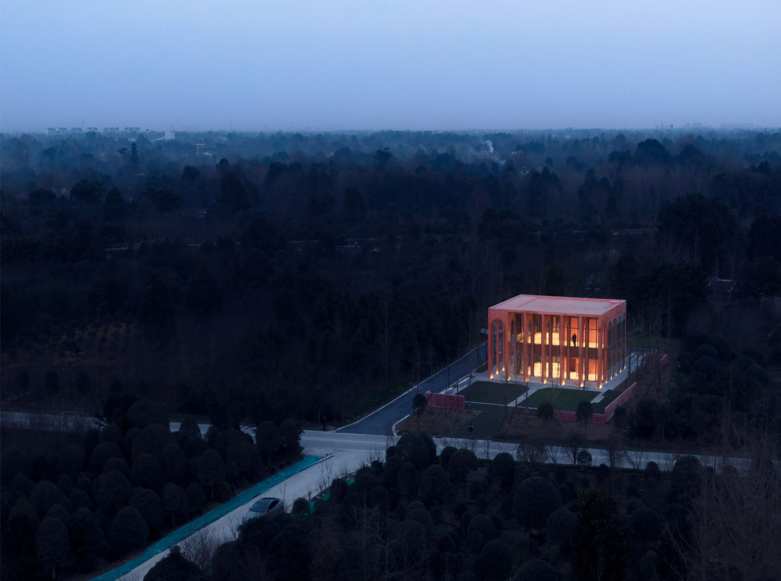 暖红色的建筑主体和海蓝色的建筑核心,这种强烈的色彩碰撞,既在回应活泼热情、内心安逸的城市人文性格,也是对兼具当代性和传统底蕴的成都地域文化的一种张力表达。